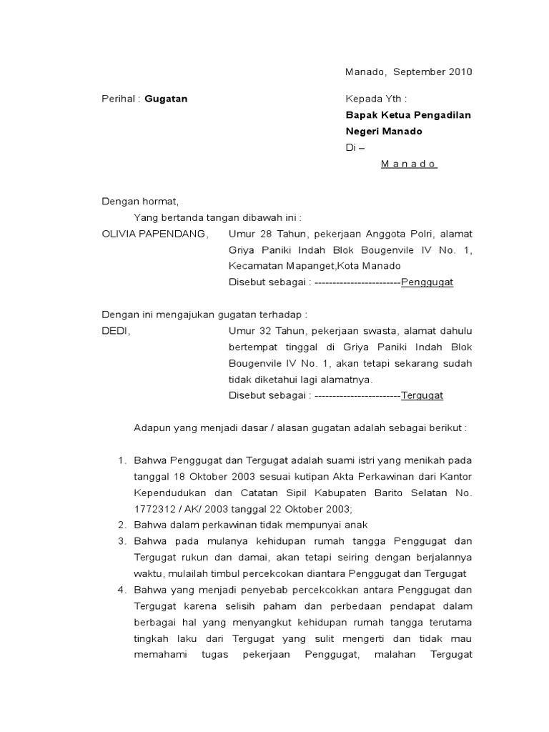 Contoh Surat Gugatan Cerai Talak from imgv2-1-f.scribdassets.com Bagaiamana cara membuatnya dan contoh surat cerai untuk anda gunakan diberbagai keperluan yang baik dan benar terlengkap. Indo it yang beralamat di jl. Gugatan cerai suami terhadap istri ini syarat. Isi surat poin utama dalam surat pernyataan cerai ini ialah pernyataan bahwa kedua belah pihak baik suami maupun istri telah setuju untuk berpisah (bercerai). 2 contoh surat perjanjian kerja. Alexander suwiryo nomor ktp : Format contoh surat gugatan cerai (isteri yang mengajukan cerai). Kedua, surat perjanjian cerai, di dalam surat tersebut menjelaskan bahwa suami istri telah resmi bercerai.